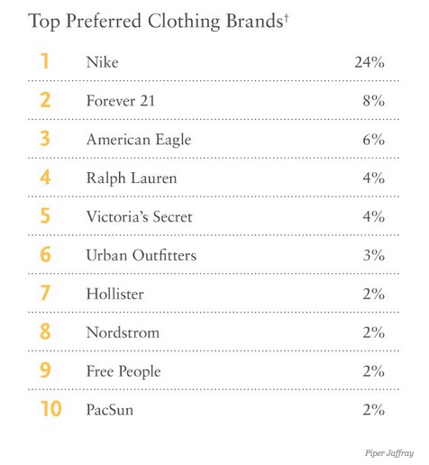What’s interesting about the way teens are spending money isn’t so much what they are spending the money on, but which brands they have loyalties for. Even teens who have part-time jobs don’t have that much of a budget to be throwing money around, so it figures that the brands they choose are ones that are important to them, and consistently serve them well. The ones that dominating the teen scene? Starbucks and Chipotle dominate food-wise, and Nike remains firmly on top in retail sales. Here’s a chart that shows the top ten retailers that teens spend money at: