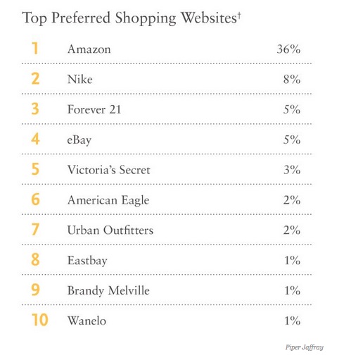 While these companies have either risen or stayed in the ranks, companies like Aeropostale and Abercrombie and Fitch have taken a hit. Online shopping has also become more popular among teens, and the sites that they tend to buy from aren’t all too surprising given their preferred brands: